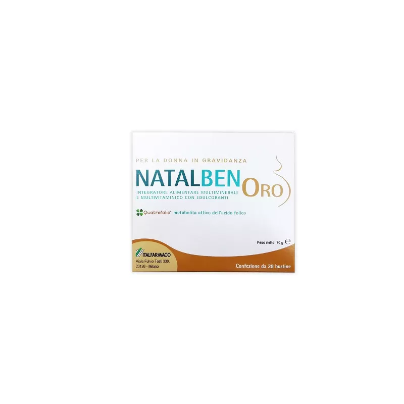 Proprietà Natalben ORO contenendo Quatrefolic 5-MTHF (5-Metiltetraidrofolato), la forma attiva dell'Acido Folico, assicura l'apporto necessario all'organismo umano durante la divisione cellulare e la crescita tissutale, particolarmente importanti durante la gravidanza.