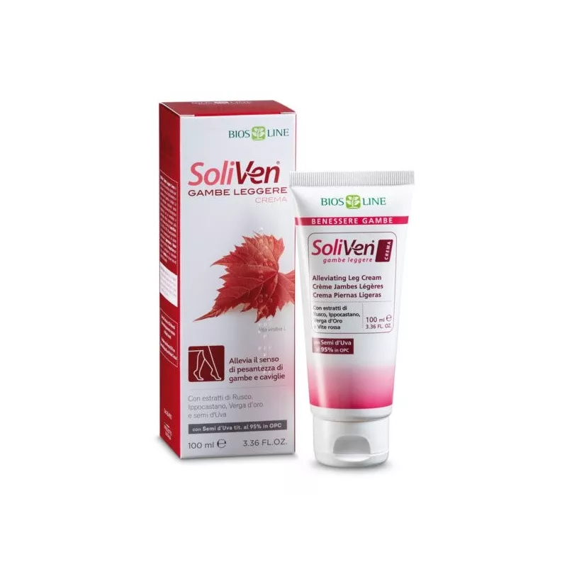 La formula di SoliVen gambe leggere favorisce la fisiologica funzionalità del microcircolo e contribuisce ad alleviare stanchezza e gonfiori, ridonando un piacevole ed immediato senso di benessere e leggerezza alle gambe. Tutto questo in virtù dell’efficacia dei suoi ingredienti erboristici: la Vite rossa in semi, che aiuta a sostenere la circolazione grazie all’elevata concentrazione di Proantocianidine (OPC); l’Ippocastano, il cui estratto di corteccia può restituire tonicità ai vasi e contrastare i gonfiori alle gambe; il Rusco, i cui principi attivi (le ruscogenine) svolgono un’azione regolante sulla permeabilità e l’elasticità dei vasi; la Solidago virga aurea, che contribuisce al drenaggio dei liquidi in eccesso.