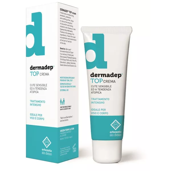 DERMADEP® TOP crema Esercita un’azione idratante, emolliente, protettiva e lenitiva, aiuta a ridurre la sensazione di disagio e prurito, legata a secchezza cutanea o in seguito ad iperattività della cute. Grazie alla sinergia dei suoi ingredienti, favorisce il rapido ripristino e il mantenimento della funzione barriera della cute.