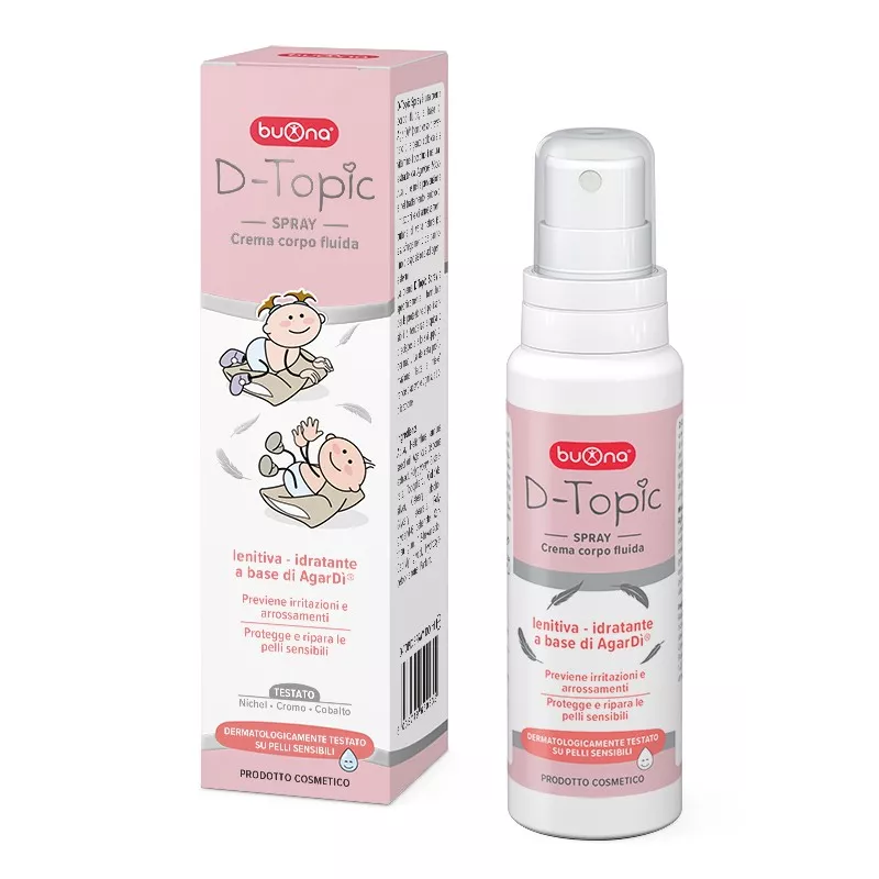 D-Topic spray è utile nella prevenzione e nel trattamento lenitivo di irritazioni e di arrossamenti cutanei di varia natura (ad es. sfregamento da pannolino o esposizione ad agenti esterni).