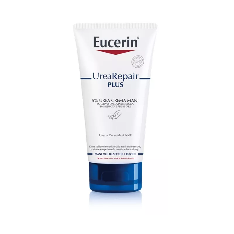 Eucerin UreaRepair Crema Mani Rigenerante 5% Urea contiene Urea, Ceramide ed altri Fattori di Idratazione Naturale (NMF). È stato clinicamente comprovato che questi ingredienti donano sollievo immediato ed un'idratazione intensa alle mani molto secche, ruvide e tese, anche dopo ripetuti lavaggi. Questa crema rafforza la naturale barriera della pelle, rendendola resistente alla secchezza fino a 48 ore.
