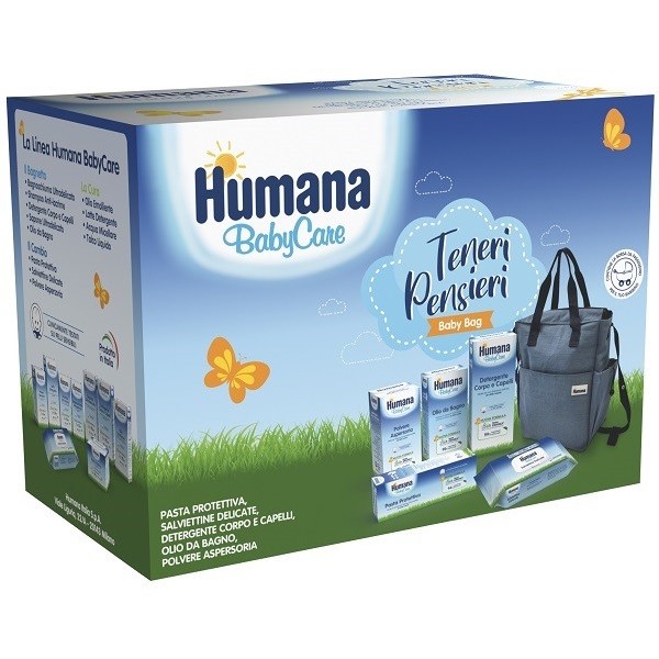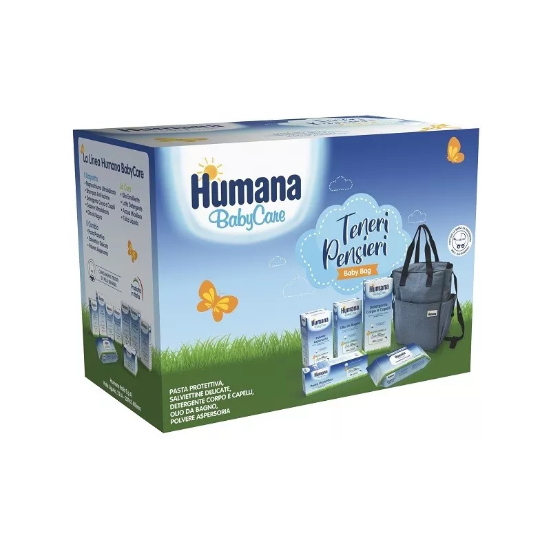 Baby bag contenente: pasta protettiva (ideale per la protezione dell’area del pannolino, sin dalla nascita), salviettine delicate (ideali per la detersione dell’area del pannolino, delle mani e del viso, sin dalla nascita), detergente corpo e capelli (ideale per una detersione delicata e quotidiana, sin dalla nascita), olio da bagno (ideale per la detersione di pelli secche, sin dalla nascita) e polvere aspersoria (ideale per rinfrescare e lasciare la pelle asciutta, sin dalla nascita).