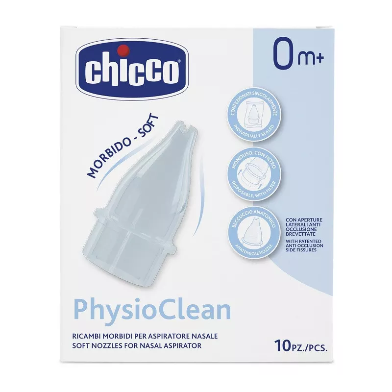 L’aspiratore nasale PhysioClean di Chicco permette l’eliminazione delle secrezioni nasali in eccesso, che possono impedire al bambino di respirare bene, in modo pratico e delicato. La forma ergonomica agevola la mamma durante l’utilizzo e il beccuccio morbido è particolarmente indicato per il nasino sensibile e delicato dei più piccoli. I beccucci monouso, con filtro già inserito, garantiscono la massima igiene. Va utilizzato ogni volta che le narici del bambino sono occluse, più volte nella giornata, in modo da mantenerle sempre libere. È buona regola praticare l’aspirazione nasale subito dopo aver instillato la soluzione fisiologica PhysioClean, dalle proprietà idratanti della mucosa nasale, azione che favorisce la rimozione delle secrezioni nasali in eccesso.