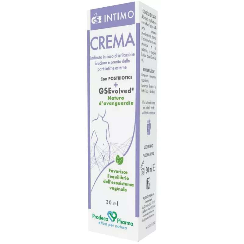 GSE Intimo Crema è un prodotto formulato con estratti vegetali e sostanze di origine naturale specificatamente scelti per dare sollievo in caso di irritazione, bruciore, arrossamento, secchezza e prurito delle parti intime esterne. Il gel di Aloe, l’olio di Oliva e gli estratti di Piantaggine e Calendula hanno un’azione emolliente, lenitiva e riducono la sensazione di prurito; gli estratti di Ippocastano e Amamelide, dall’azione astringente, contribuiscono a ridurre l’edema e il rossore. L’Estratto di semi di Pompelmo potenziato dal processo di iperfermentazione (GSEvolved) svolge un’azione antiossidante. I Fitosteroli vegetali, particolarmente indicati in caso di pelle secca e irritata, ristabiliscono l’equilibrio del microbiota. La formula è arricchita dalla presenza di postbiotici da Bifidobatteri e Lattobacilli che contribuiscono al bilanciamento della flora batterica e al mantenimento della barriera cutanea. La presenza di Acido lattico favorisce il fisiologico equilibrio dell’ecosistema vaginale.
