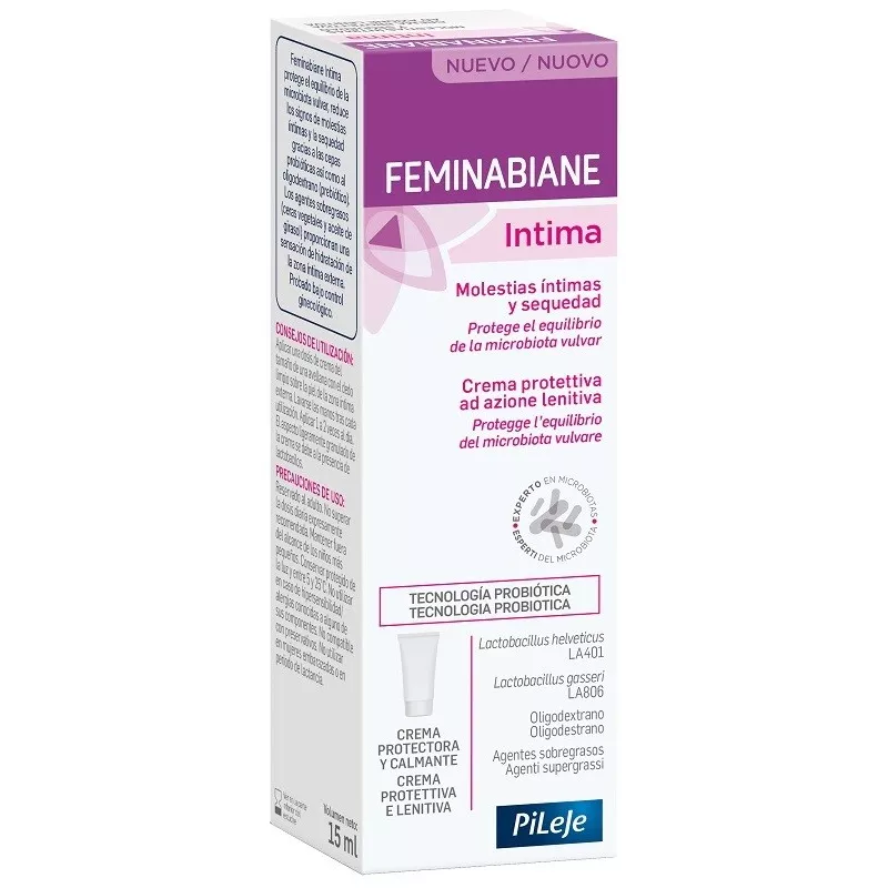 Feminabiane Intima protegge l’equilibrio del microbiota vulvare, riduce i segni di discomfort intimo e secchezza intima grazie a 2 ceppi probiotici e all’oligodestrano (prebiotico). Le cere vegetali e l’olio di girasole forniscono una sensazione di idratazione della zona intima esterna. Testato sotto controllo.