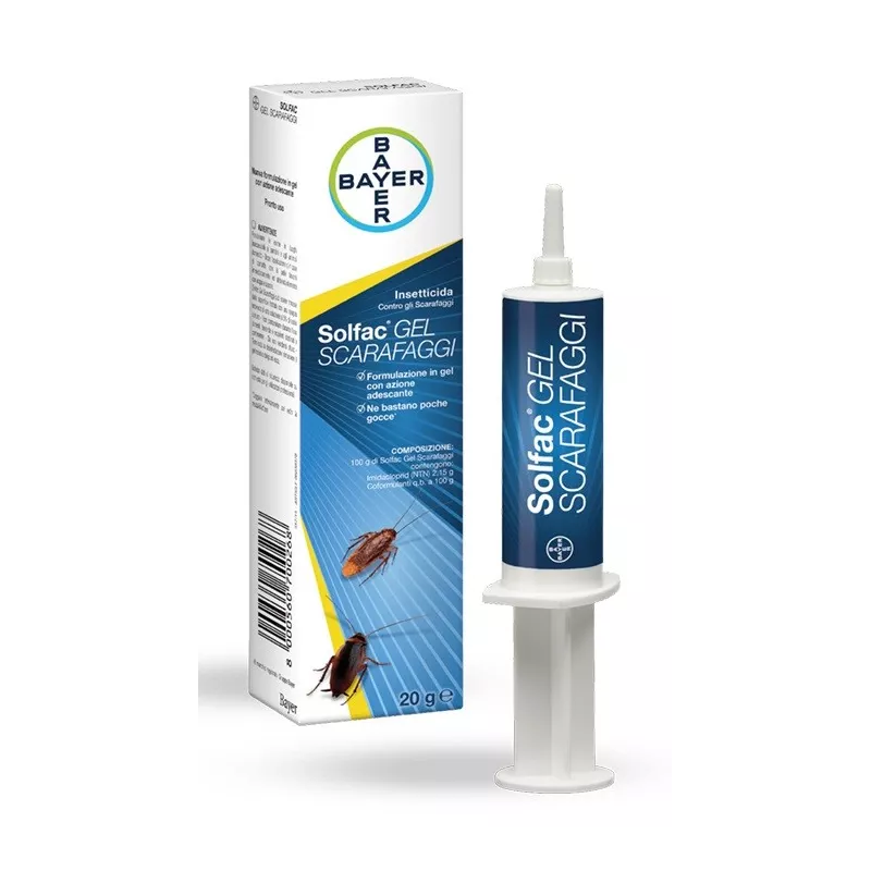 Prodotto biocida. Si usa in gocce. Formulazione in gel adescante. È un'esca particolarmente appetibile e attrattiva. L'effetto si attiva qualche ora dopo l'ingestione da parte degli insetti. Il prodotto ha odore e colori neutri e mostra un'eccezionale aderenza sulle superfici consentendone l'impiego in punti difficili. Il trattamento con Solfac Gel Scarafaggi non richiede particolari preparativi preliminari, pertanto le normali attività lavorative possono proseguire durante l'applicazione e non necessita che le persone si allontanino dall'area interessata.