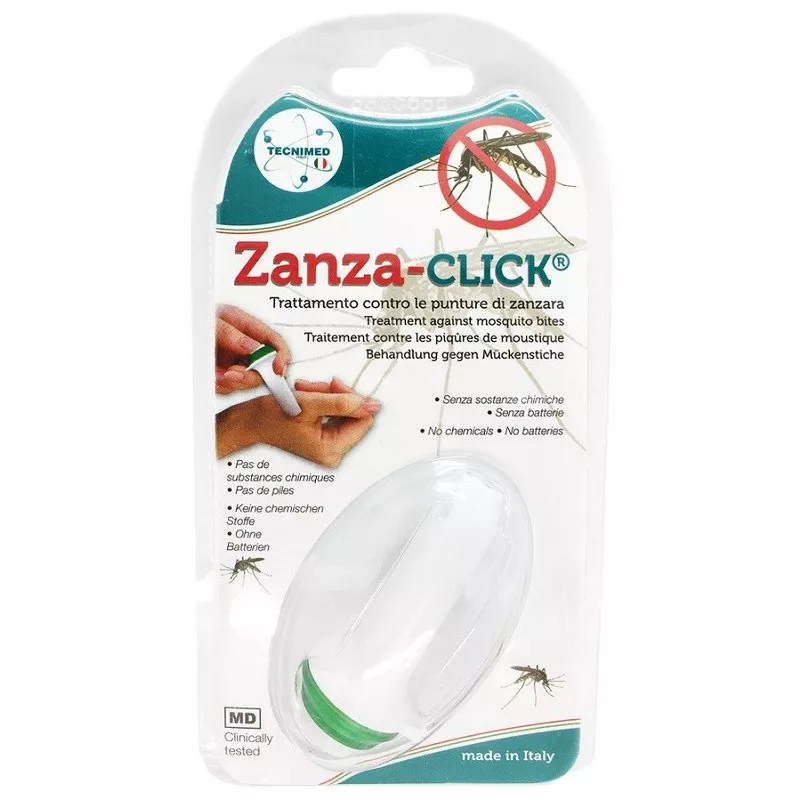 - ripetere. Ad ogni impulso sarà percepita la sensazione di un piccolo pizzicore, che varia a seconda della sensibilità individuale e può essere avvertita maggiormente dai bambini. L’effetto benefico si avvertirà dopo qualche minuto. Per avere i migliori risultati, utilizzare l’apparecchio il più presto possibile dopo la puntura o non appena si avverte il prurito o ci si accorge della puntura. Agganciare Zanza-Click ad un mazzo di chiavi tramite l’apposito anellino, per averlo sempre a portata di mano.