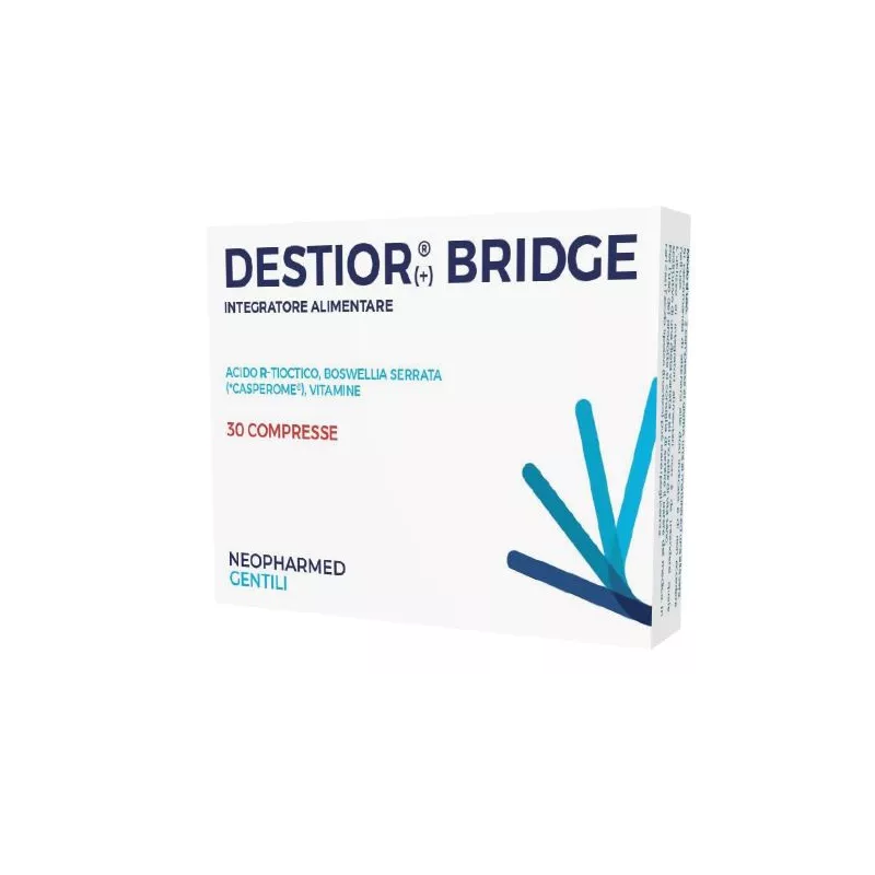 Descrizione Integratore alimentare a base di acido R-tioctico, Boswellia serrata e vitamine. Destior bridge è un prodotto nutrizionale contenente una molecola normalmente sintetizzata dall'organismo, l'acido tioctico o alfa-lipoico nella sua forma fisiologica R(+). L'acido R(+) tioctico/alfa-lipoico è sintetizzato nei tessuti ed è inoltre presente in taluni alimenti di normale consumo. La formulazione di Destior bridge contiene anche un fitosoma di Boswellia serrata che si avvale dell'azione modulatrice di questa sostanza, soprattutto in quelle condizioni che si connotano per ampia presenza di stress ossidativo. Sia l'acido R(+)-alfa-lipoico che la Boswellia serrata concorrono al controllo antiossidante ed antiradicalico. La formulazione di Destior bridge contempla infine un apporto vitaminico: in particolare vitamina E, che contribuisce alla protezione delle cellule dallo stress ossidativo, e vitamine del gruppo B (B1 e B6) che contribuiscono al normale funzionamento del sistema nervoso.