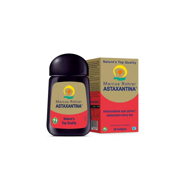 Descrizione Integratore alimentare a base di astaxantina naturale, estratta da Haematococcus pluvialis, microalga con attività antiossidante.