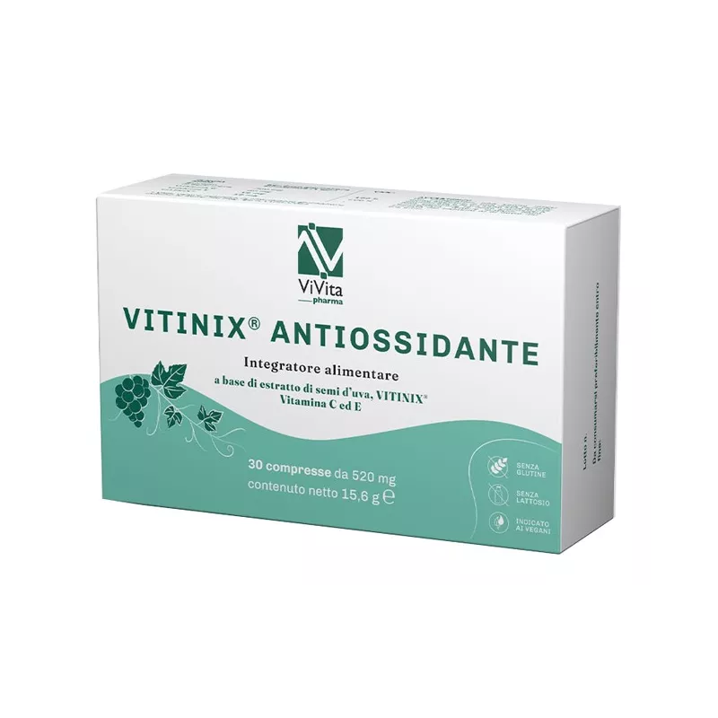 Descrizione Integratore alimentare a base di estratto di semi d'uva (Vitis vinifera L.) in combinazione con VITINIX, vitamina C e vitamina E. Una formulazione con alto potere antiossidante utile per contrastare gli effetti nocivi dello stress ossidativo.