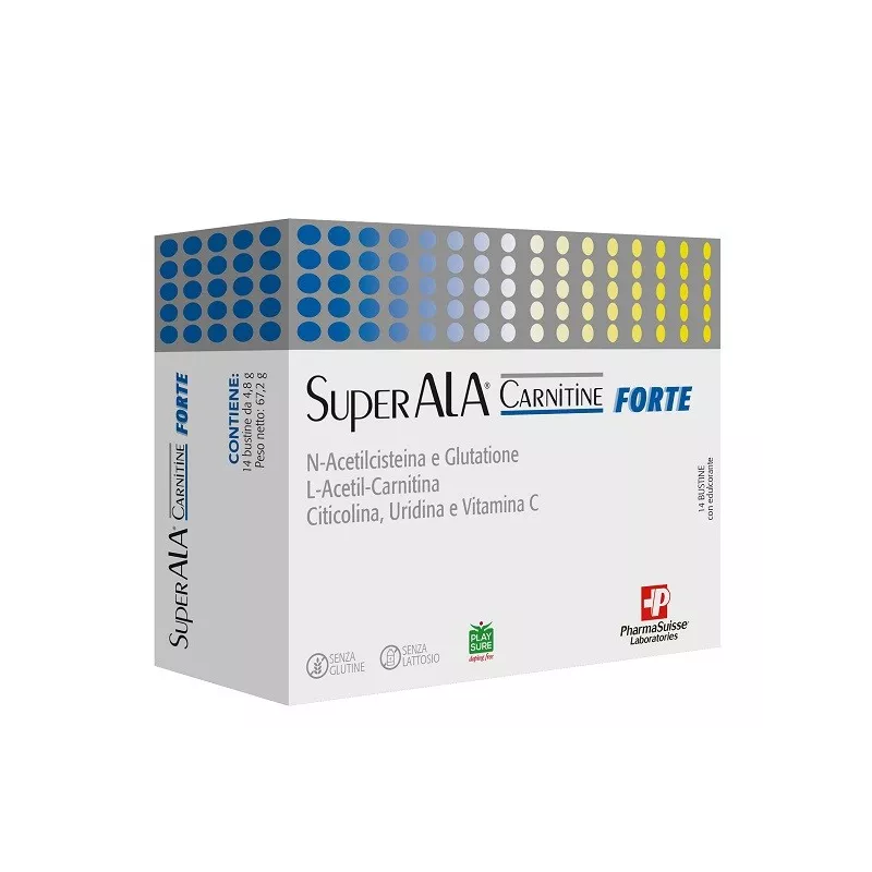 Descrizione Superala carnitine forte è un integratore alimentare a base di N-acetilcisteina, glutatione, L-acetil-carnitina, citicolina, uridina e vitamina C, utile in caso di ridotto apporto con la dieta o aumentato fabbisogno di tali nutrienti. La vitamina C contribuisce al normale funzionamento del sistema nervoso, alla riduzione della stanchezza e dell’affaticamento e al normale metabolismo energetico.