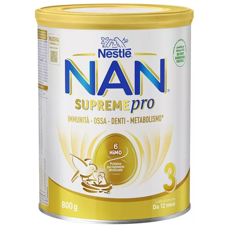 Seguire le istruzioni esattamente. L'uso di acqua e biberon non bolliti, la ricostituzione, la conservazione, la manipolazione, la preparazione e la somministrazione non corretti possono essere causa di rischi per la salute del bambino. NESTLÉ NAN SUPREME pro 3 non è un sostituto del latte materno, ma un latte di crescita idoneo all'alimentazione del bambino sano da 12 mesi in avanti. L'allattamento al seno dovrebbe durare più a lungo possibile.