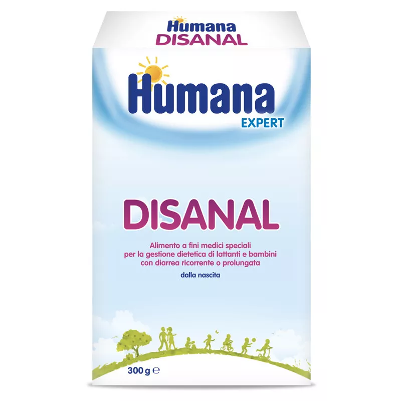 La formula di Humana Disanal contribuisce alla gestione dietetica della diarrea ricorrente o prolungata. Gli eventi di diarrea sono spesso accompagnati da una temporanea riduzione della normale attività della lattasi e dal conseguente malassorbimento del lattosio. Il contenuto di lattosio di Humana Disanal è stato pertanto ridotto così da non gravare ulteriormente sull'intestino già alterato. In caso di diarrea la funzionalità digestiva del bambino può essere temporaneamente compromessa , è stato quindi ridotto il contenuto di lipidi nella formulazione Humana Disanal per prevenire un assorbimento incompleto e facilitare il lavoro dell'intestino. L'elevata quantità di fibre, tra cui quelle presenti nella banana, e l'effetto stringente della farina di riso facilitano un rapido ripristino della corretta consistenza fecale. Humana Disanal inoltre, grazie alla sua particolare formulazione, ha un gusto gradevole facilmente accettato in caso di diarrea.