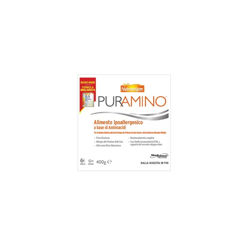 Descrizione Formula ipoallergenica a base di aminoacidi realizzata per lattanti e bambini con grave allergia alle proteine del latte vaccino, intolleranze alimentari multiple o nei casi in cui si renda necessaria una dieta elementare. Nutramigen Puramino è privo di lattosio e contiene DHA, acidi grassi omega-3 che supportano il normale sviluppo visivo del lattante*. L'olio di trigliceridi a catena media fornisce una fonte di grassi ed energia facilmente disponibile in caso di malassorbimento dei grassi. Non cambiare formula senza avere consultato il pediatra che consiglierà inoltre l'introduzione di alimenti complementari nella dieta al divezzamento. Nutramigen Puramino, per la sua formulazione particolare, non ha il sapore e l'odore dei latti per la prima infanzia. I bambini alimentati con Nutramigen Puramino possono produrre feci morbide frequenti e di colore da verde a scuro.