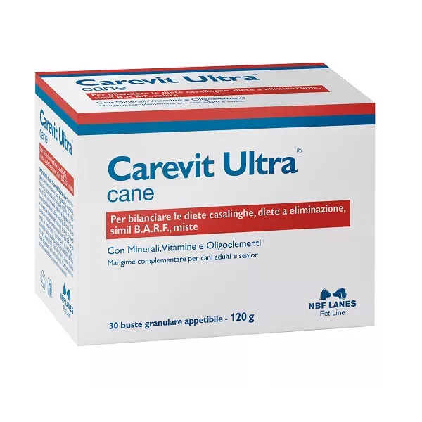 Carevit Ultra cane è un mangime complementare per cani in granulare appetibile, formulato rispettando le linee guida FEDIAF ed i riferimenti NRC, con minerali, vitamine e oligoelementi essenziali per bilanciare la dieta casalinga del cane adulto e anziano, le diete ad eliminazione, le diete a base di carne e/o frattaglie senza cereali (simil B.A.R.F. senza ossa), le diete miste (commerciale + casalinga : quando la dieta casalinga apporta più del 50% del fabbisogno energetico).