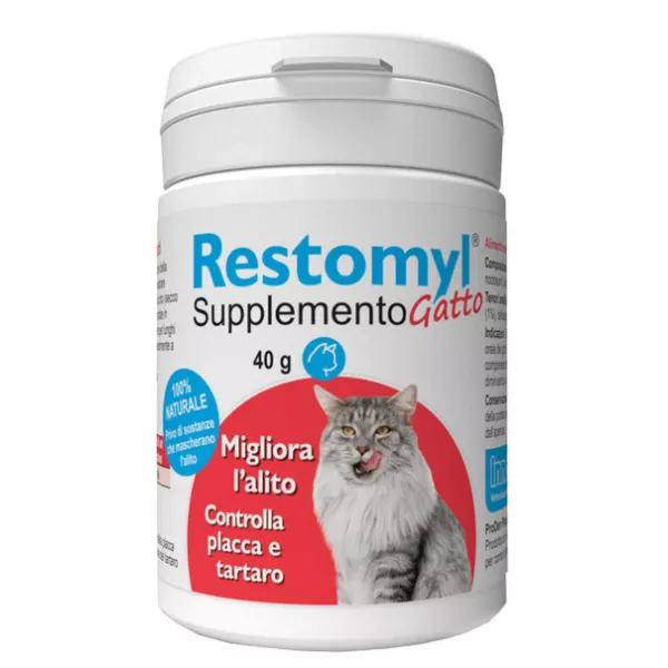 Descrizione Supporto nutrizionale per la salute del cavo orale del gatto. Previene la formazione e l'adesione della placca sulla superficie dentaria, migliorando l'alito e rallentando la deposizione del tartaro. Contiene Ascophyllum nodosum purificato (alga specificatamente selezionata). Privo di additivi, conservanti, zuccheri e glutine. Prodotto completamente naturale. Non contiene alcuna sostanza che maschera l'alito. Restomyl Supplemento non è un farmaco veterinario, ma un alimento complementare per cani e gatti.