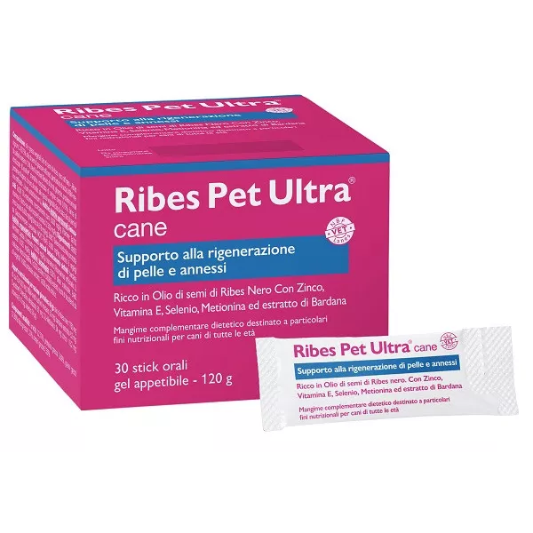 Ribes Pet Ultra gel appetibile è un mangime complementare dietetico destinato a particolari fini nutrizionali per cani di taglia medio-grande, ad elevata concentrazione di acidi grassi essenziali e con estratto di bardana e vitamina E, come supporto della funzione dermica in caso di dermatosi ed eccessiva perdita di pelo. L'apporto dietetico di acidi grassi polinsaturi w-6 e w-3 favorisce la normale funzionalità della barriera cutanea. Ricco in olio di ribes nero a elevata concentrazione di acidi grassi essenziali con estratto di bardana e vitamina E.