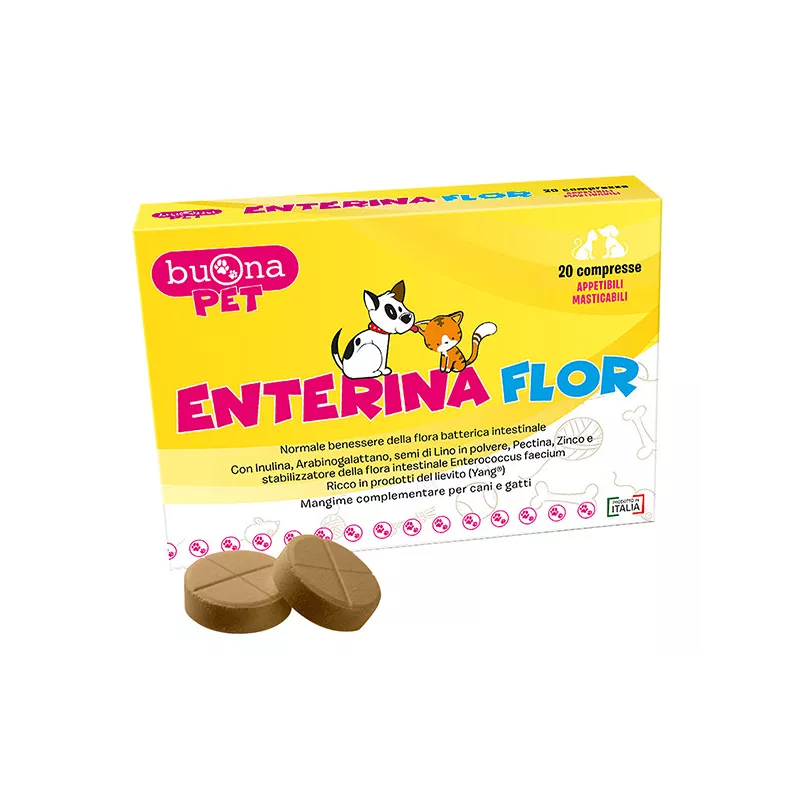 ENTERINA FLOR è formulato con Prodotti del lievito (Yang), Inulina da radici di Cicoria, Arabinogalattano da corteccia di Larice, semi di Lino in polvere, Zinco, Pectina ed Enterococcus faecium (additivo stabilizzatore della flora intestinale), per favorire il normale benessere della flora batterica intestinale nel cane e nel gatto.