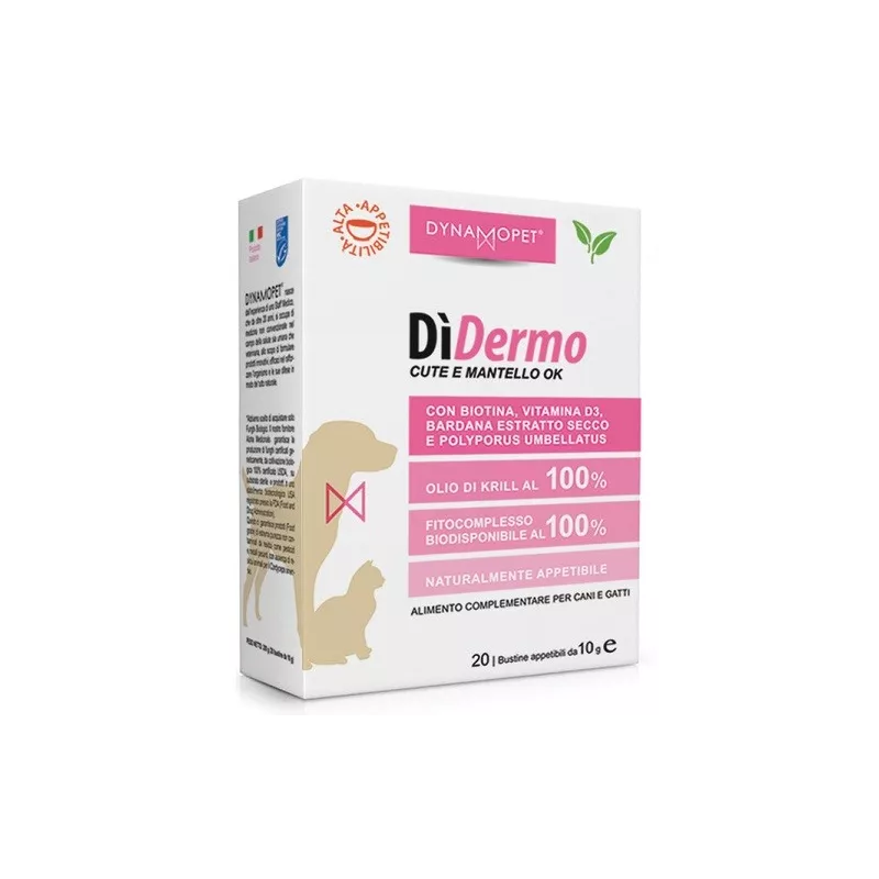 Descrizione Alimento complementare utile per sostenere il fisiologico benessere di cute ed annessi cutanei. La formula è arricchita con omega 3 da olio di krill e biotina. I suoi fitocomplessi, uniti alla presenza nella formula di omega 3 da purissimo olio di Krill di ottima assimilabilità, ne fanno un prodotto unico e irrinunciabile per il benessere dell'animale.