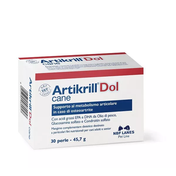 Artikrill Dol cane è un mangime complementare dietetico formulato con acidi grassi omega-3 (EPA) da olio di pesce e con un livello adeguato di vitamina E per il supporto del metabolismo articolare in caso di osteoartrite del cane.