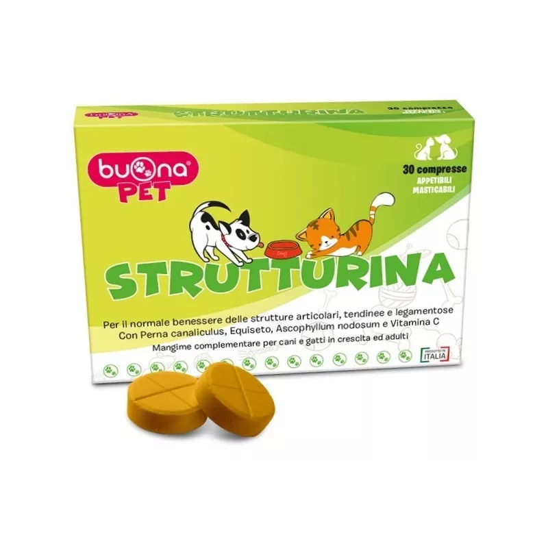 Modalità d'uso Somministrare le compresse di STRUTTURINA direttamente in bocca all’animale o sminuzzate nel cibo gradito. Completare la razione giornaliera con l’alimento abituale. Lasciare sempre acqua fresca a disposizione.