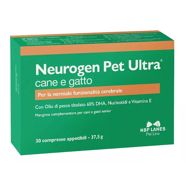 Neurogen Pet Ultra è un mangime complementare per cani e gatti anziani formulato con olio di pesce, colina, lieviti, curcuma e vitamina E per la normale funzionalità cerebrale.