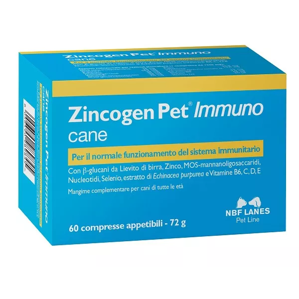 Con beta-glucani da Lievito di birra, zinco, MOS-mannanoligosaccaridi, nucleotidi, selenio, estratto di echinacea purpurea e vitamine B6, C, D, E.