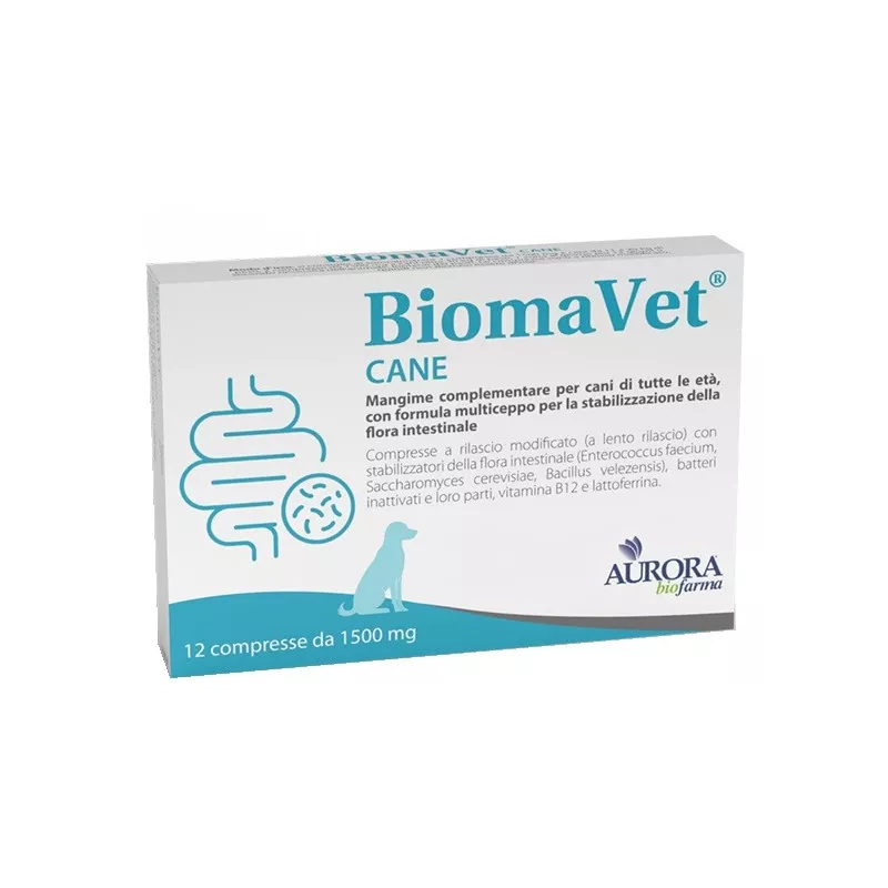 BiomaVet cane apporta tre differenti ceppi probiotici vivi (Enterococcus faecium, Saccharomyces cerevisiae e Bacillus velezensis) che favoriscono il fisiologico equilibrio della flora intestinale, contribuendo in tal modo anche al fisiologico contrasto della proliferazione della flora batterica indesiderata nell'intestino.