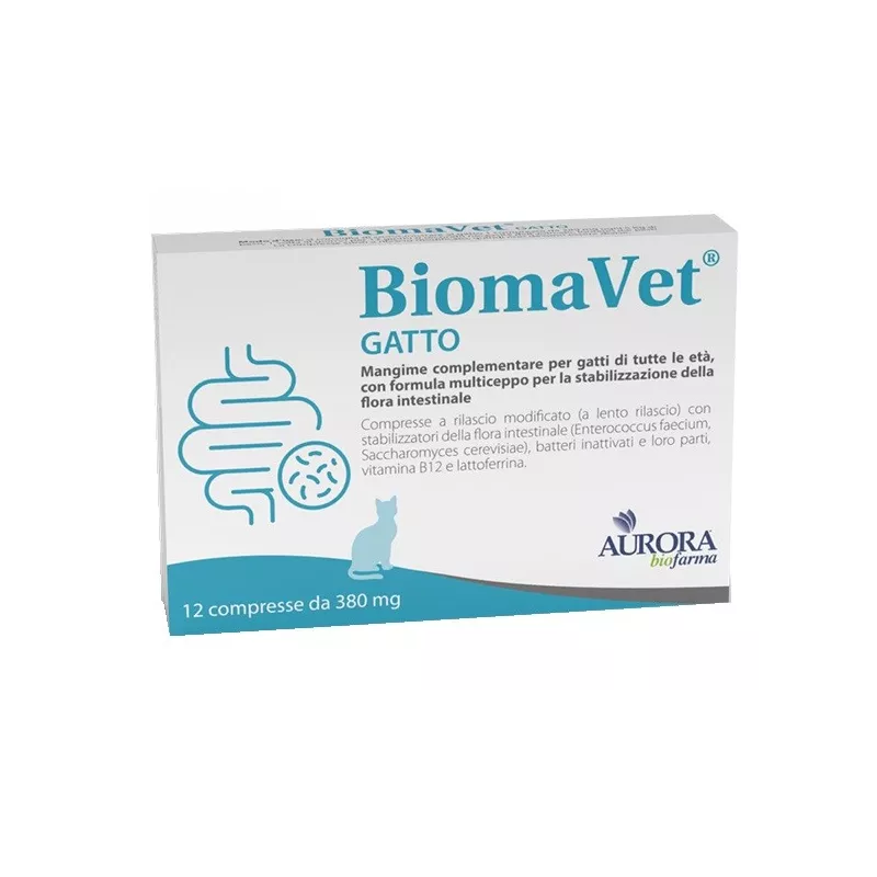 Mangime complementare multiceppo per gatti di tutte le età che apporta probiotici e contribuisce alla stabilizzazione della flora intestinale. BiomaVet gatto è formulato in compresse a rilascio modificato (lento rilascio) per permettere il rilascio nell'intestino dei probiotici e degli altri elementi nutritivi apportati. BiomaVet gatto apporta due differenti ceppi probiotici vivi (Enterococcus faecium, Saccharomyces cerevisiae) che favoriscono il fisiologico equilibrio della flora intestinale, contribuendo in tal modo anche al fisiologico contrasto della proliferazione della flora batterica indesiderata nell'intestino.