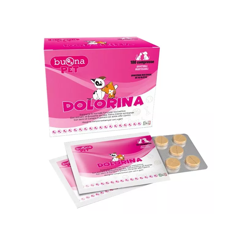 Descrizione Mangime complementare per cani e gatti con estratti di Boswellia serrata e Salice bianco, Ananas gambo, semi di Canapa ed Acido alfa-Lipoico. DOLORINA è formulata in compresse appetibili masticabili ed è utile per supportare la normale funzione nocicettiva nell’animale.