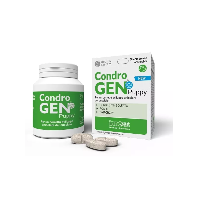 Descrizione Mangime complementare per un corretto sviluppo articolare del cucciolo. La salute articolare è la chiave del movimento e del benessere generale del cane. Condrogen Puppy è indicato per garantire il corretto sviluppo articolare durante la fase di accrescimento dei cuccioli di razze grandi/giganti.