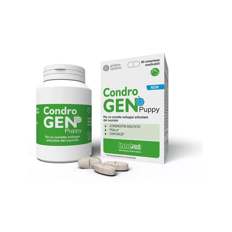 Descrizione Mangime complementare per un corretto sviluppo articolare del cucciolo. La salute articolare è la chiave del movimento e del benessere generale del cane. Condrogen Puppy è indicato per garantire il corretto sviluppo articolare durante la fase di accrescimento dei cuccioli di razze grandi/giganti.