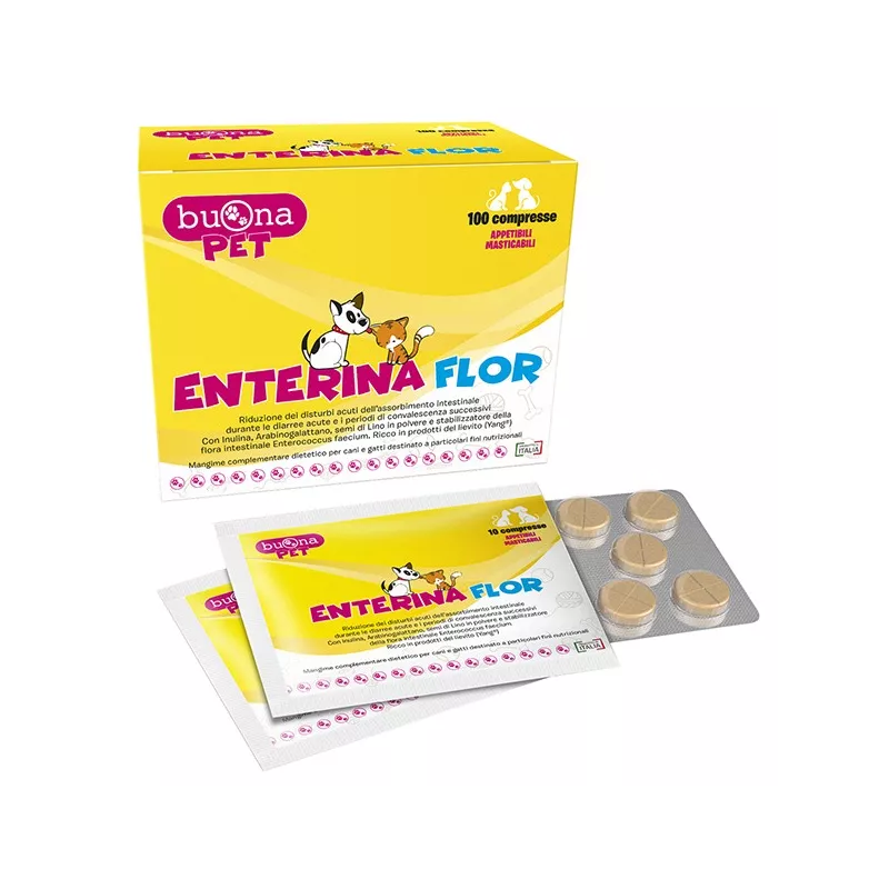 ENTERINA FLOR è formulato con Prodotti del lievito (Yang), Inulina da radici di Cicoria, Arabinogalattano da corteccia di Larice, semi di Lino in polvere, Zinco, Pectina ed Enterococcus faecium (additivo stabilizzatore della flora intestinale), per favorire il normale benessere della flora batterica intestinale nel cane e nel gatto.