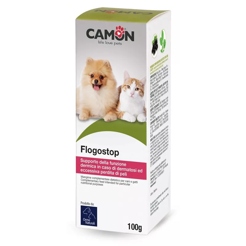 Mangime complementare dietetico per cani e gatti, che agisce come supporto alla funzione dermica in caso di dermatosi ed eccessiva perdita di peli, arrossamento, prurito e cattivo odore della cute.