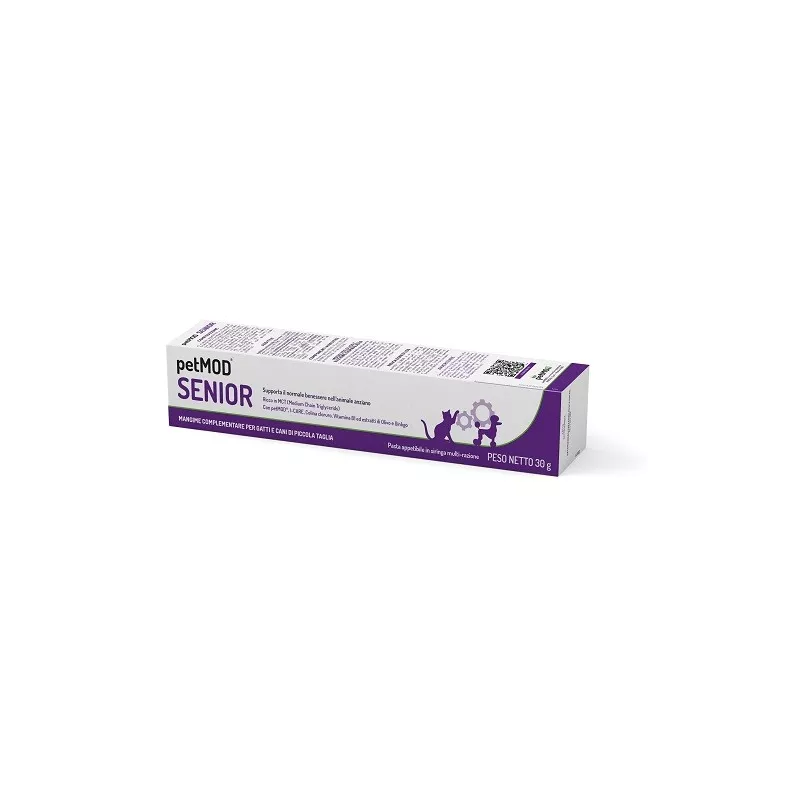 Descrizione Mangime complementare per gatti e cani di piccola taglia anziani in pasta appetibile formulato ad alto contenuto in MCT (trigliceridi a media catena), con olio di pesce, petMOD, I-CARE, colina cloruro, vitamina B1 ed estratti di olivo e ginkgo per favorire il normale benessere dell'animale anziano.