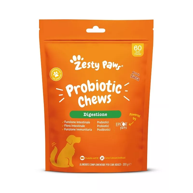 Alimento complementare per cani adulti. L'EpiCor Pets Postbiotic supporta la salute del sistema immunitario e dell'intestino, il Calsporin supporta la normale funzione intestinale, gli oligosaccaridi sono una fonte di prebiotici per nutrire i batteri intestinali buoni.