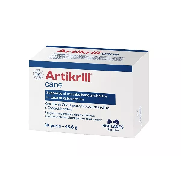 Artikrill cane è un mangime complementare dietetico formulato con acidi grassi omega-3 (EPA) da olio di pesce e con un livello adeguato di vitamina E per il supporto del metabolismo articolare in caso di osteoartrite del cane.