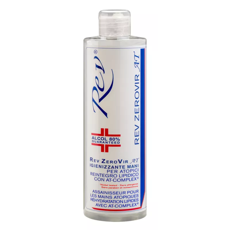 Igienizzante mani per pelli sensibili a base di Alcol ad alta concentrazione. Il sistema AT (Atopic Complex) reintegra i liquidi della pelle con un sistema di fermentati (Acido Oleico, Acido Linoleico e Acido Palmitico), Acido Ialuronico ed Aloe completano la sua efficacia per la cute degli atopici.