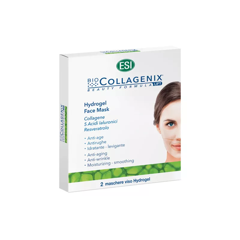 Maschera per il trattamento del viso, realizzata con uno speciale hydrogel contenente un concentrato di principi naturali: collagene marino di tipo I e III, resveratrolo, 5 acidi ialuronici con diversi pesi molecolari per limitare l'evaporazione dell'acqua dalla cute e preservarne l'elasticità.