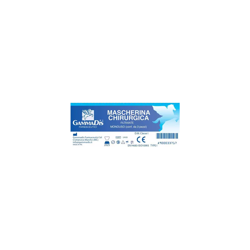 Maschera facciale a 3 veli (Tessuto non tessuto Spun-Bond, Melt-blown, tessuto non tessuto Spun-Bond) in grado di garantire una barriera che limita la trasmissione di agenti infettivi. La mascherina oltre alla capacità di filtraggio è dotata di una buona vestibilità, i comodi elastici assicurano che la mascherina aderisca ai lati della faccia e lo strato a contatto con la pelle è morbido e non abrasivo. La Mascherina Chirurgica Gammadis è un dispositivo medico, monouso, non sterile, idoneo per coprire naso, bocca e mento. Sono destinate all'uso da parte di operatori sanitari per protezione da possibili contatti con liquidi/aerosol potenzialmente contaminate. Si indossa fissando gli elastici intorno alle orecchie, al fine di limitare la trasmissione di agenti infettivi. Colore: bianche, blu, verdi. Misure: 17,5 cm x 9,5 cm.