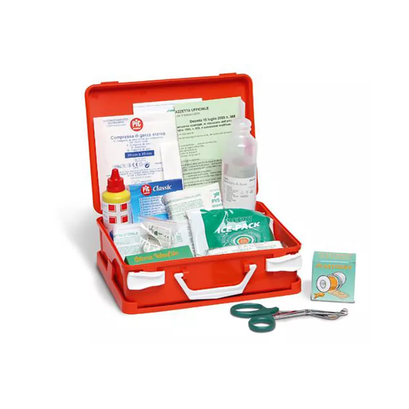 1 copia Decreto Min. 388 del 15.07.03, 2 paia guanti sterili, 1 flacone disinfettante 125 ml iodopovidone al 10% iodio PMC, 1 flacone soluzione fisiologica sterile 250 ml CE, 1 busta compressa garza sterile cm 18x40, 3 buste compressa garza sterile cm 10x10, 1 pinzetta sterile monouso da medicazione, 1 confezione di cotone idrofilo, 1 conf. di cerotti di varie misure pronte all’uso, 1 rocchetto cerotto adesivo m 5x2,5 cm, 1 benda di garza da m 3,5x10 cm, 1 paio di forbici cm. 10, 1 laccio emostatico, 1 ghiaccio istantaneo monouso, 1 sacchetto per rifiuti sanitari mm 250x350, 1 istruzioni multilingua pronto soccorso.