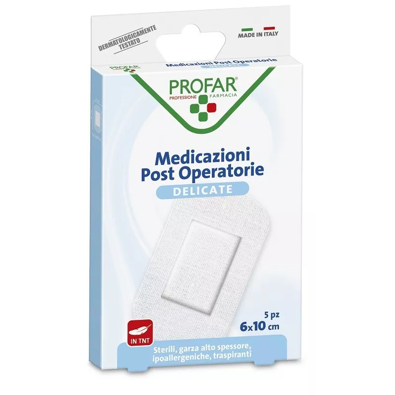 Medicazioni post operatorie delicate sterili, garza alto spessore, ipoallergeniche, traspiranti.