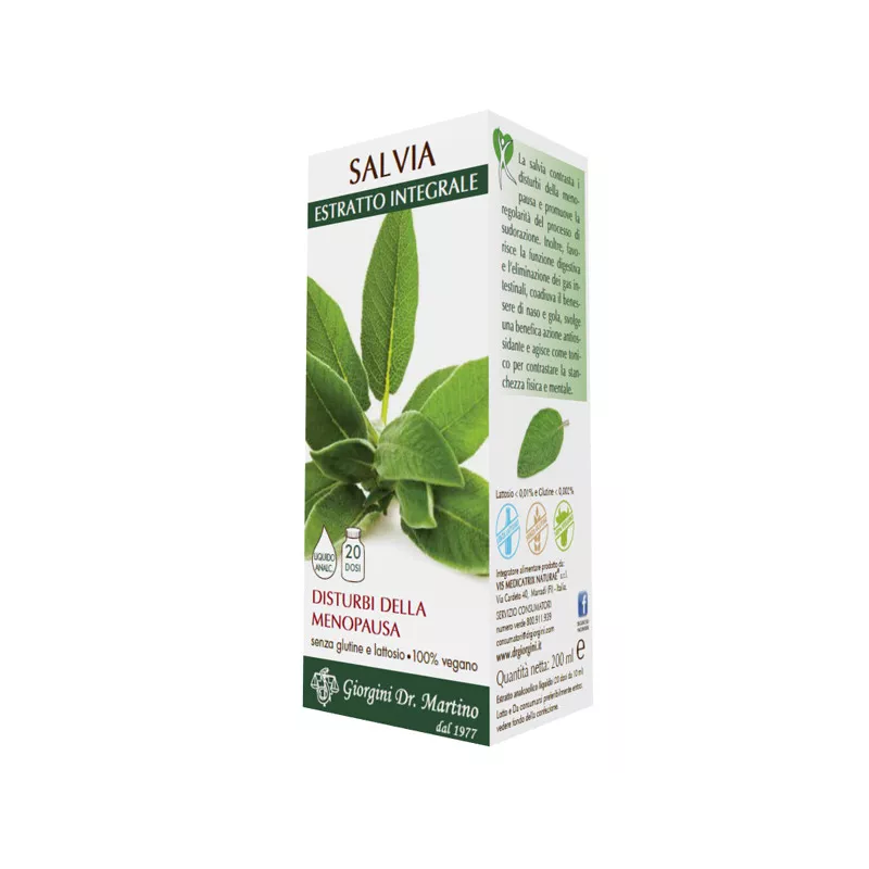 La salvia contrasta i disturbi della menopausa e promuove la regolarità del processo di sudorazione. Inoltre, favorisce la funzione digestiva e l'eliminazione dei gas intestinali, coadiuva il benessere di naso e gola, svolge una benefica azione antiossidante e agisce come tonico per contrastare la stanchezza fisica e mentale. L'estratto integrale del Dr. Giorgini contiste in un estratto concentrato contenente l'intero fitocomplesso della pianta. L'efficacia e la qualità del prodotto sono garantite dall'estrazione sottovuoto e a bassa temperatura che permette di preservare integri tutti i principi attivi e nutritivi della pianta (fitocomplesso). L'eventuale presenza di resine e oli essenziali in superficie e/o di sedimento sul fondo del prodotto sono garanzia di qualità. Infatti essi costituiscono le frazioni insolubili del fitocomplesso. Per questo motivo si raccomanda di agitare ogni volta prima dell'uso.