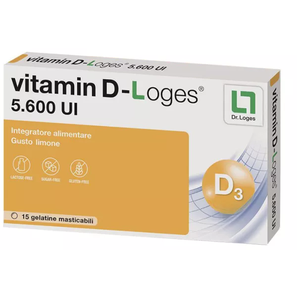 Integratore alimentare. La vitamina D contribuisce all'assorbimento del calcio e del fosforo, contribuisce a mantenere ossa e denti sani, sostiene le normali funzioni del sistema immunitario e la normale funzione muscolare. Vitamin D-Loges 5.600 UI è una gelatina masticabile al gusto limone di vitamina D 5.600 UI. Non necessita di acqua per l’assunzione e presenta un’elevata biodisponibilità e una maggiore velocità di assorbimento rispetto alle capsule.