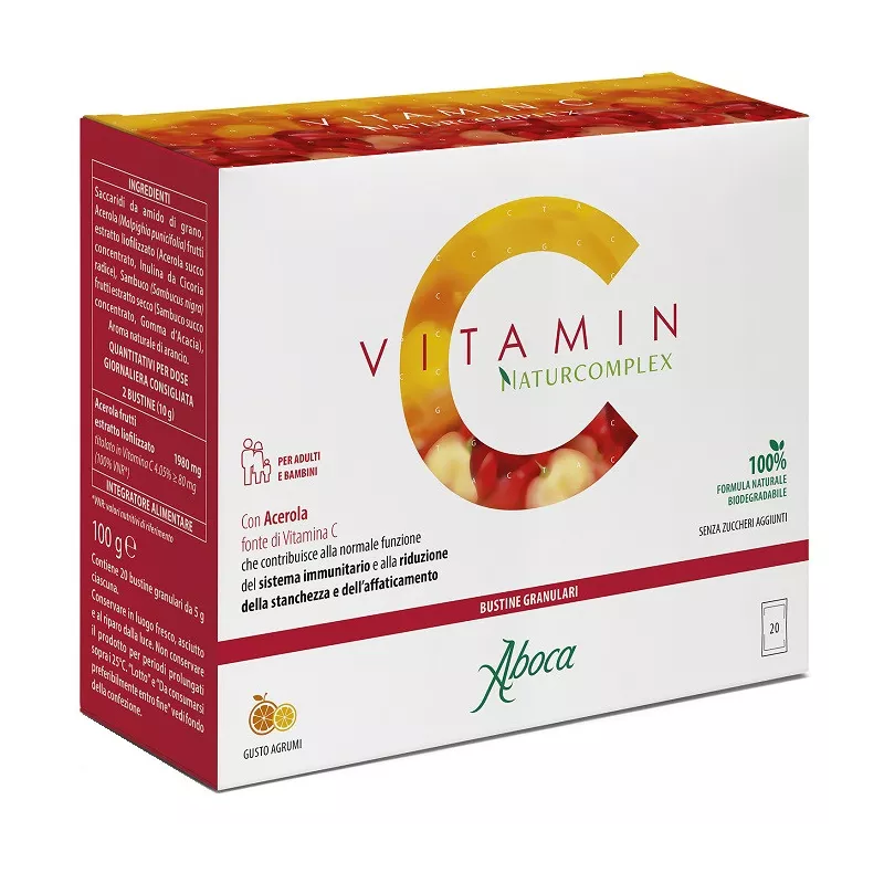 Descrizione Vitamin C Naturcomplex è un integratore alimentare 100% naturale che fornisce la dose giornaliera consigliata di vitamina C insieme alle altre sostanze naturalmente presenti nell’estratto di acerola, come i flavonoidi tra cui quercetina e antocianine. Queste sostanze contribuiscono ad una biodisponibiltà ideale della vitamina C e ne completano il potere antiossidante. La vitamina C contribuisce: al buon funzionamento del sistema immunitario, alla riduzione della stanchezza e dell’affaticamento, alla protezione delle cellule dallo stress ossidativo e al normale funzionamento del sistema nervoso. Inoltre la vitamina C contribuisce alla normale formazione del collagene per la funzione di ossa, cartilagini, denti, gengive, pelle e accresce l’assorbimento del ferro.