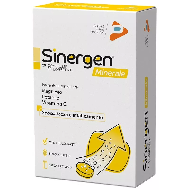 Sinergen Minerale contribuisce alla riduzione della stanchezza e dell'affaticamento, al normale metabolismo energetico e all'equilibrio elettrolitico grazie al magnesio e alla normale funzione del sistema nervoso e muscolare grazie all'azione di magnesio e potassio. Inoltre, la vitamina C aiuta il normale metabolismo energetico.