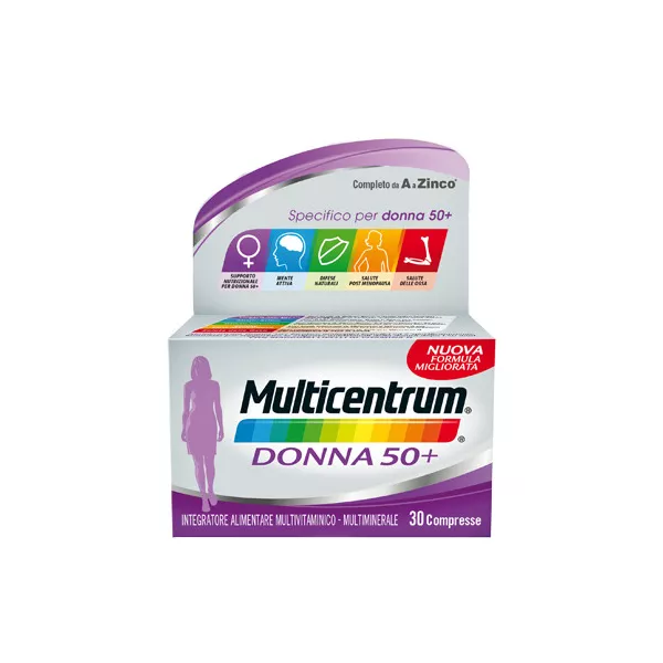 Modalità d'uso Una compressa al giorno da deglutire con acqua anche lontano dai pasti. Multicentrum Donna 50+ può essere assunto anche per periodi prolungati. La compressa deglutibile di Multicentrum Donna 50+ può essere comodamente divisa in due parti per facilitarne l'assunzione servendosi del pratico invito al taglio.