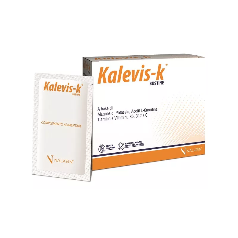 KALEVIS-K® bustine è un complemento alimentare a base di Magnesio, Potassio, Sodio, Creatina, Vitamine B1, B6, B12 e C, indicato nei casi di ridotto apporto con la dieta o di aumentato fabbisogno di tali elementi. La Vitamina C e la Vitamina B1 contribuiscono al normale metabolismo energetico. La Vitamina B12 e la Vitamina B6 sono utili alla riduzione della stanchezza e dell’affaticamento. Il Magnesio favorisce l’equilibrio elettrolitico. Il Potassio contribuisce alla normale funzione muscolare e al mantenimento di una normale pressione sanguigna.