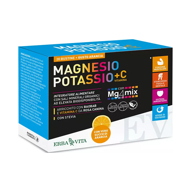 Descrizione Integratore alimentare a base di sali minerali ad elevata biodisponibilità. Con Mg4Mix, speciale complesso di quattro diverse fonti di magnesio, e K2Complex, sinergia di due fonti di potassio. Il prodotto pertanto risulta utile in tutti i casi di ridotto apporto nutrizionale o di aumentato fabbisogno di tali elementi. Il magnesio contribuisce al mantenimento dell’equilibrio elettrolitico, partecipa al normale metabolismo energetico e concorre alla riduzione di stanchezza e affaticamento. Il potassio supporta la fisiologica funzione muscolare. Il prodotto è arricchito con vitamina C da rosa canina e polpa del frutto di boabab. La vitamina C contribuisce alla protezione delle cellule dallo stress ossidativo e supporta la normale funzione del sistema immunitario, mentre rosa canina e baobab svolgono un’azione di sostegno e ricostituente.