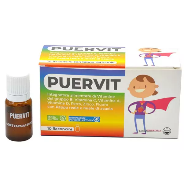 Descrizione Integratore alimentare di vitamine del gruppo B (B6, B1, B2, niacina, acido pantotenico, B12), vitamina D, vitamina A, vitamina C, ferro, zinco, fluoro con pappa reale e miele di acacia.
